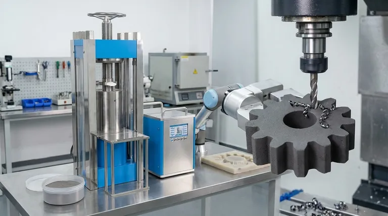الفائدة الأقوى هي القدرة على أداء التشغيل الأخضر. هذه هي عملية القطع، أو الحفر، أو الطحن للمكون قبل تلبيده. نظرًا لأن الجزء لا يزال ناعمًا نسبيًا، فإن التشغيل سريع وسهل بشكل لا يصدق.